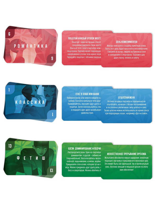 В игре всего 3 колоды. Чем ярче колода, тем откровеннее в ней задания. Если ваша пара ещё только начала узнавать друг друга, то воспользуйтесь самой светлой колодой.