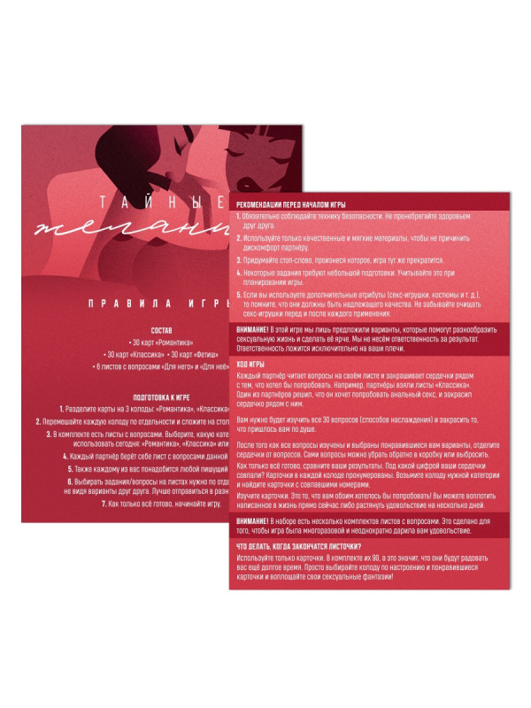 «Тайные желания» – это больше, чем просто игра. Это инструмент для построения более глубоких и искренних отношений, который поможет вам и вашему партнёру раскрыть свои истинные желания и воплотить их в жизнь.