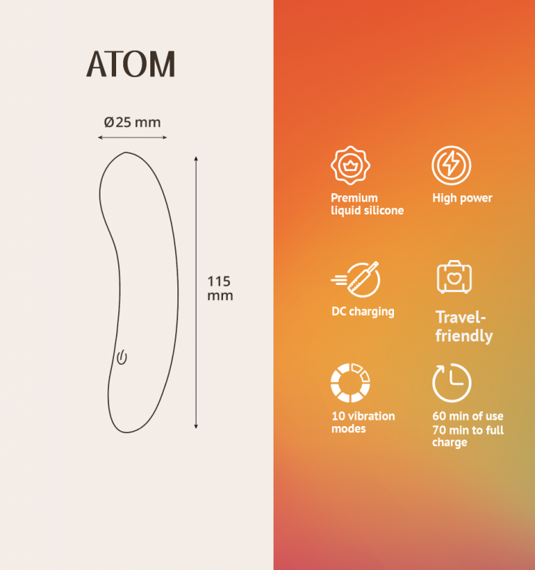Выполненный из премиального жидкого силикона нового поколения, Atom дарит нежные тактильные ощущения и идеально ложится в руку, предлагая удобство и удовольствие в тревел-формате.